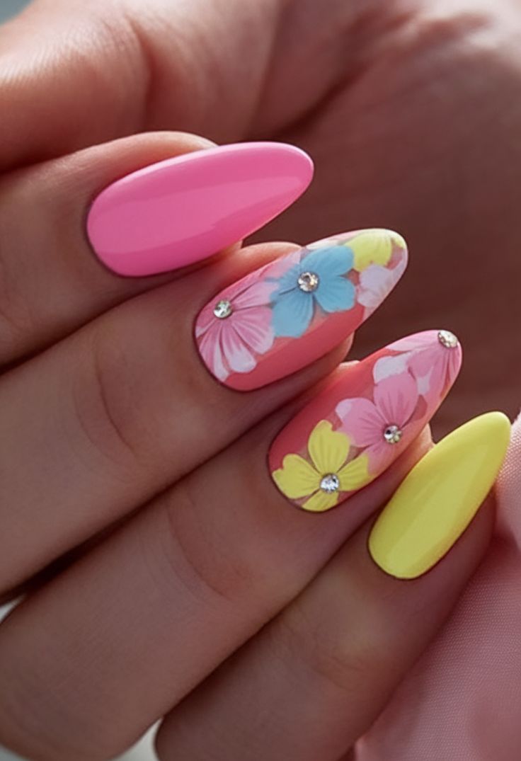 Bright pink and yellow nails are mixed with soft floral accent nails, finished with subtle sparkle details. The look is playful, colorful, and sweetly summery.
