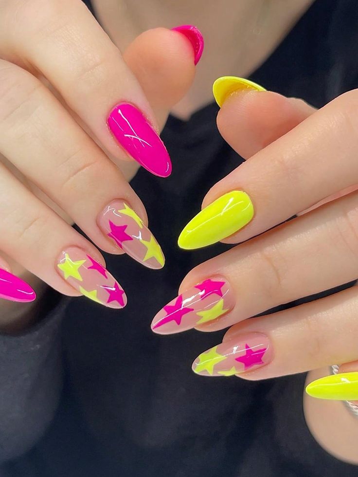 Bold neon pink and yellow shades are paired with star patterns on a clear base for a fun, eye-catching design. The vibe is youthful, energetic, and festival-ready.