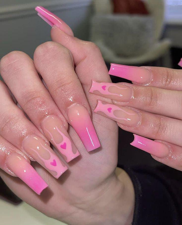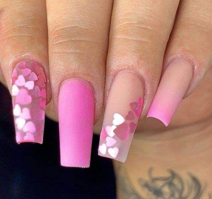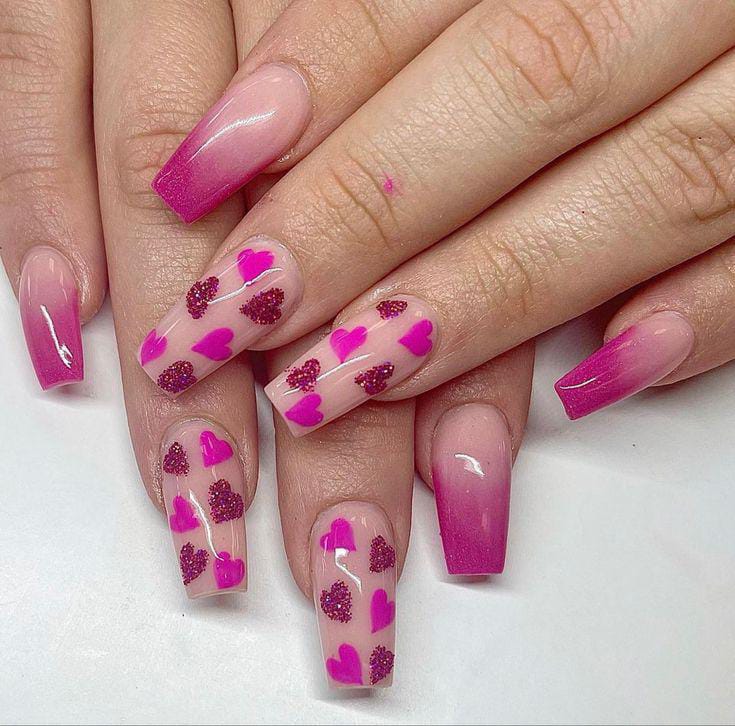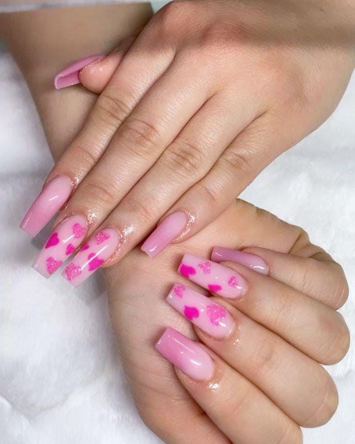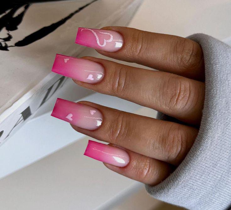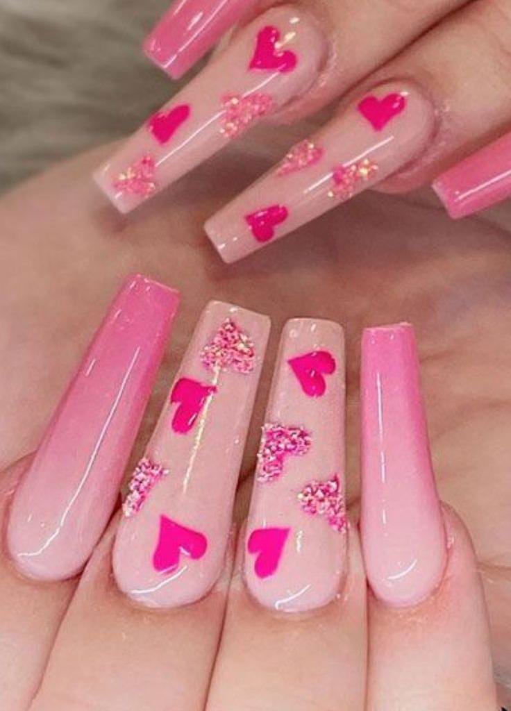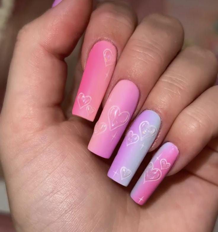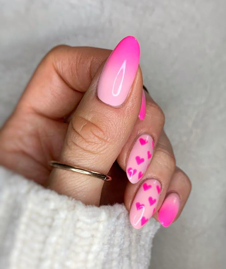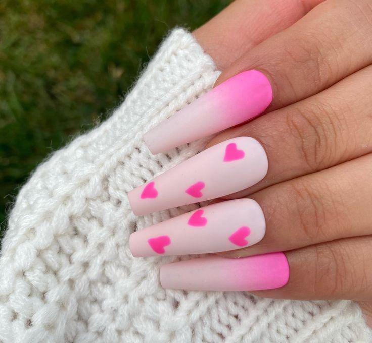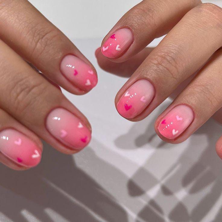 A smooth pink ombre base is paired with scattered heart patterns for a cute Valentine vibe. The style feels fun, youthful, and perfect for a sweet love-inspired look.