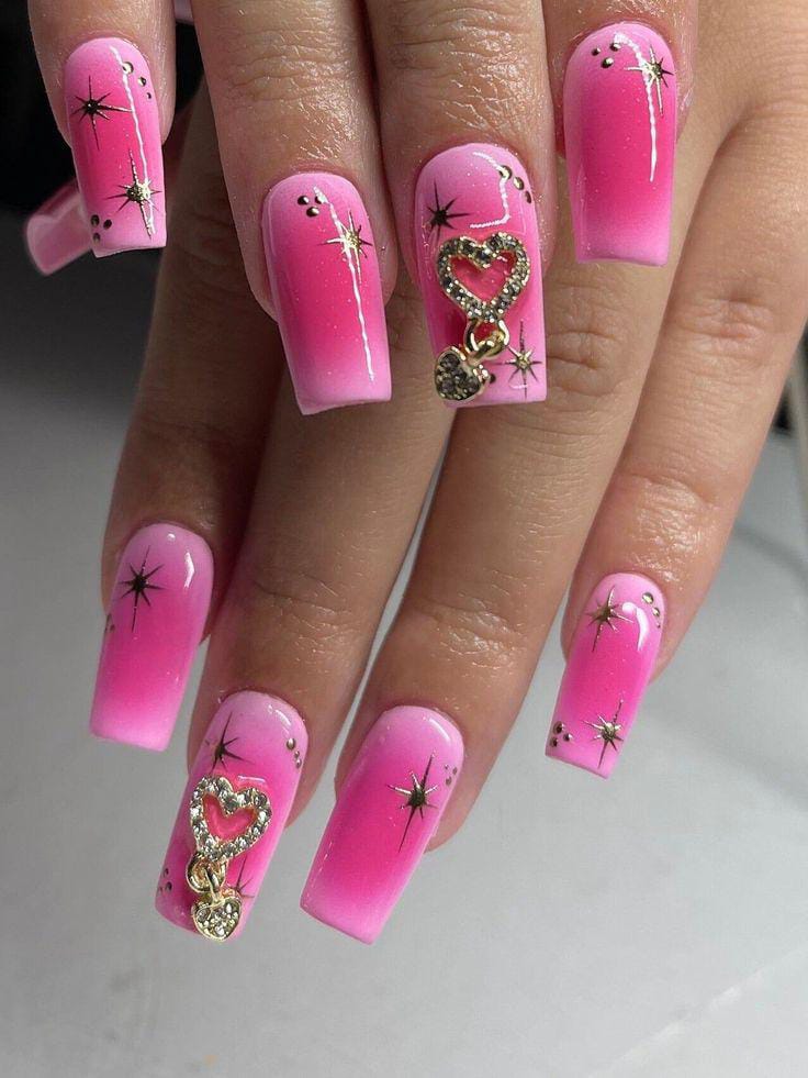 Bright pink ombre nails are enhanced with star-like accents and dangling heart charms for a statement look. The overall vibe is playful, glamorous, and full of Valentine energy.