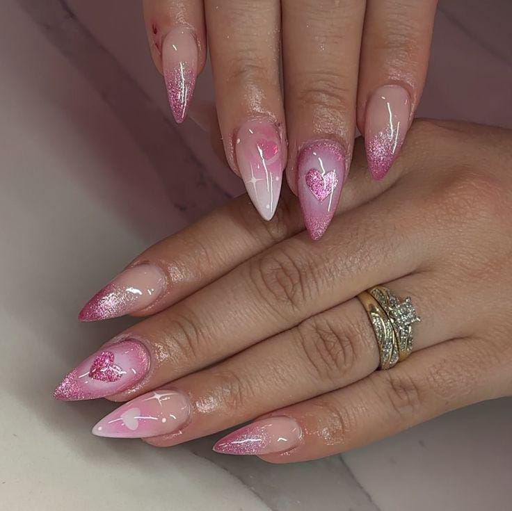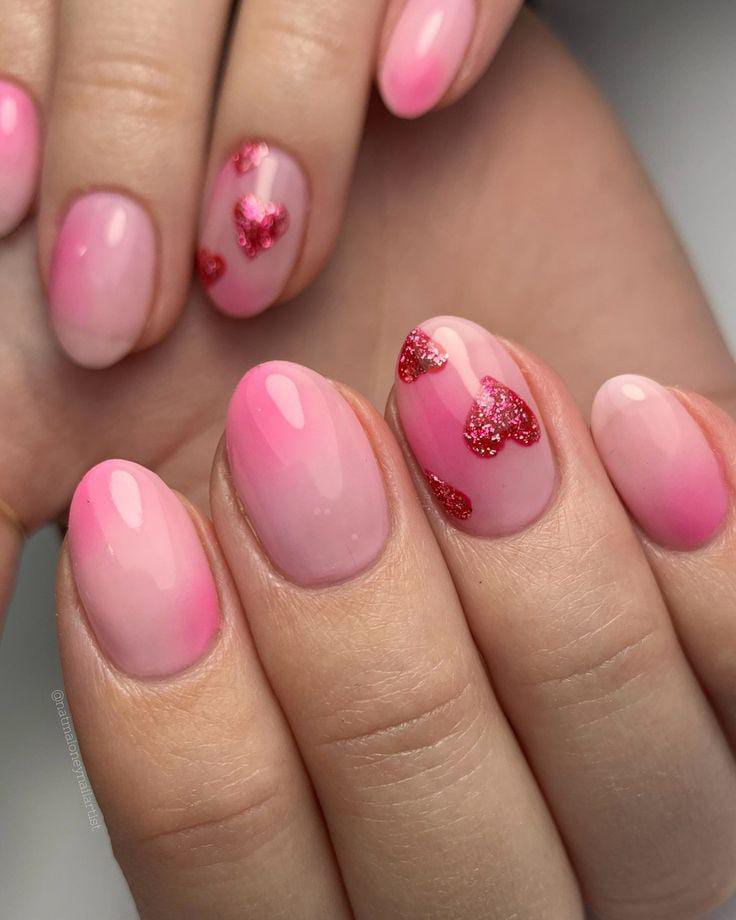 This design features a pink-to-nude ombre with glittery accents and delicate heart details. The overall look feels elegant, festive, and perfect for a Valentine celebration.