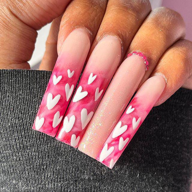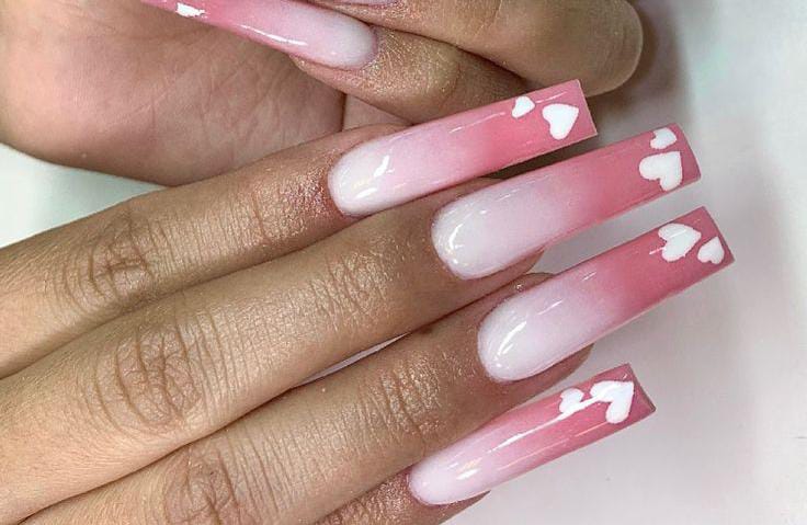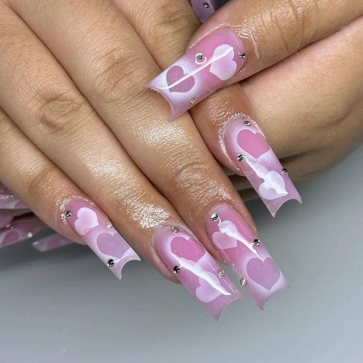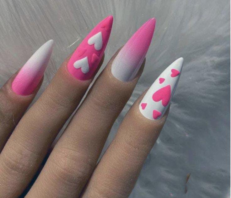 A pink-to-white ombre creates a clean base, highlighted with bold heart details. The look is simple yet striking, giving a classic Valentine feel with a modern edge.