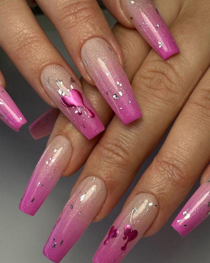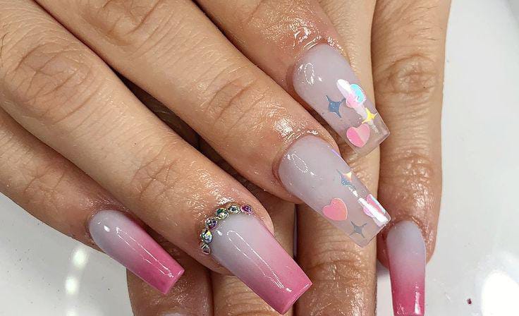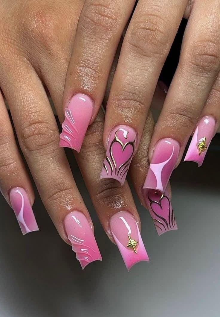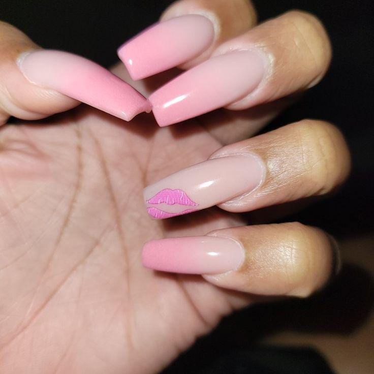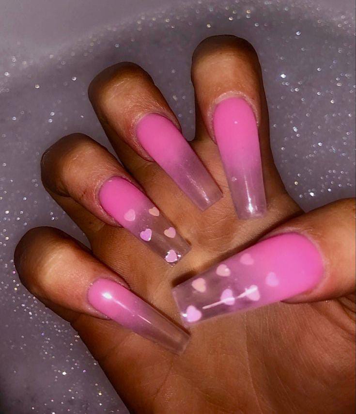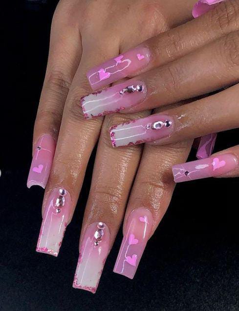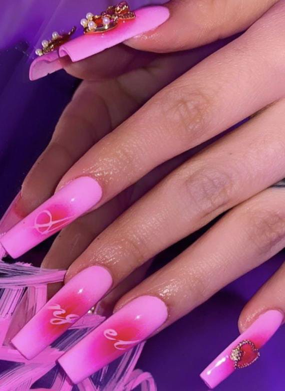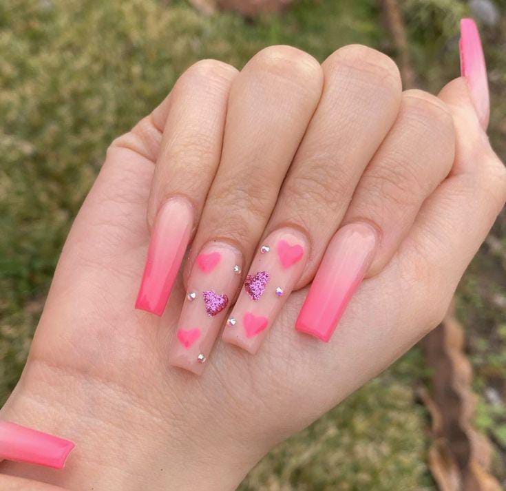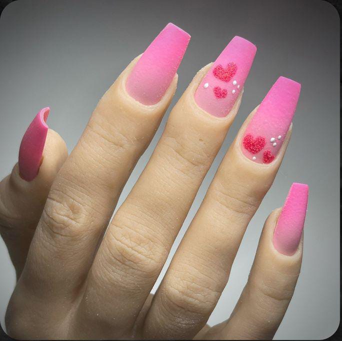 A modern pink ombre is paired with heart accents and a high-shine finish for a polished look. The design feels classy with a subtle Valentine twist.