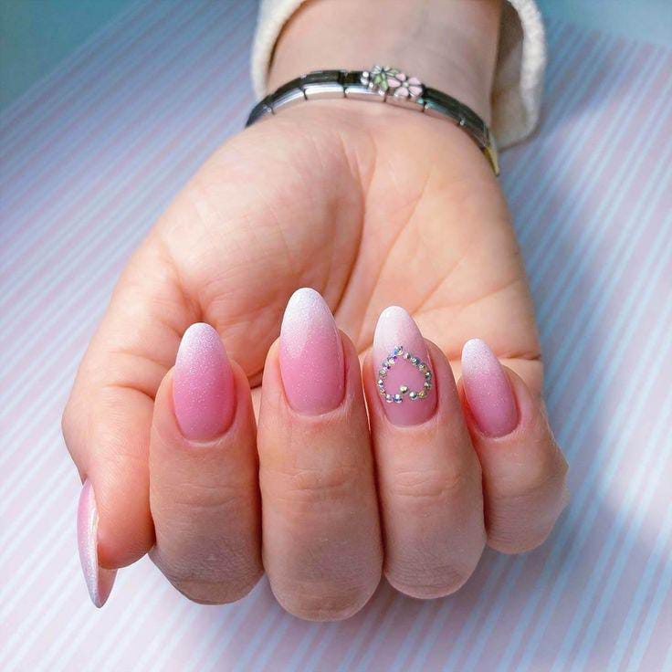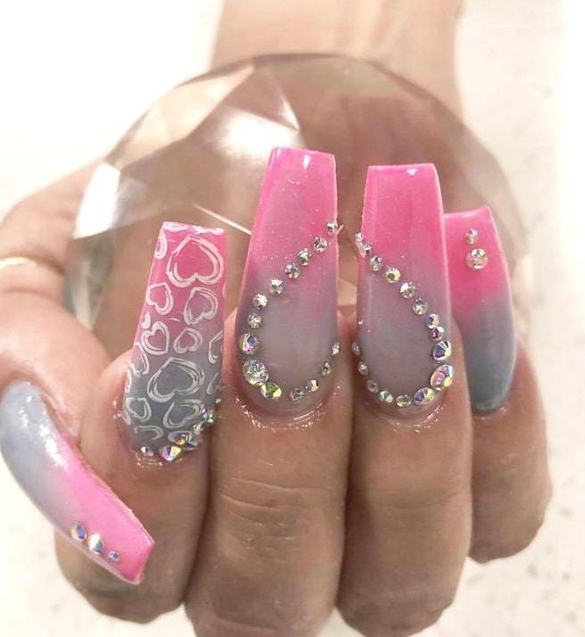 A pink-to-nude gray ombre is elevated with sparkling rhinestones and glossy shine for a glamorous finish. The style feels bold, elegant, and perfect for a statement Valentine look.