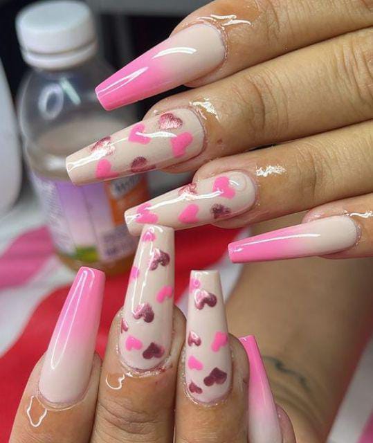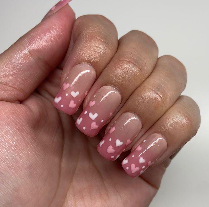 A nude-to-pink ombré base is decorated with scattered pink heart patterns for a playful Valentine feel. The look is fun, flirty, and eye-catching without being too bold.