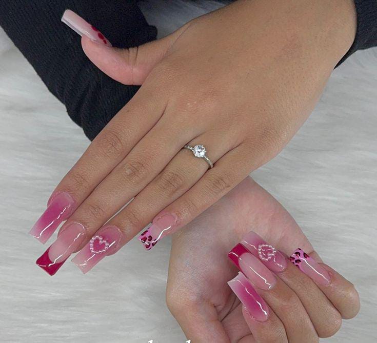 This design features a smooth nude-to-hot-pink ombre on square-shaped nails with a glossy finish. It is simple, bold, and perfect for a timeless Valentine vibe.