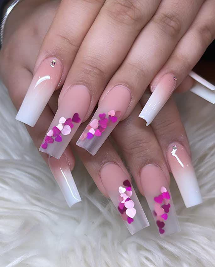 This design features a soft nude-to-white pink ombre with floating heart confetti accents sealed inside the nails. The overall vibe is delicate, romantic, and perfect for a subtle Valentine’s look.