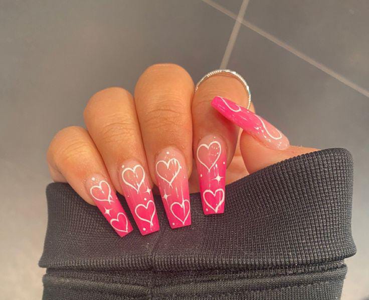 This look showcases a bold hot-pink ombre base with hand-drawn white heart outlines across the nails. It has a fun, flirty vibe with a modern, graphic Valentine aesthetic.