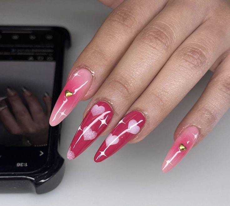 A vibrant pink ombre pairs with glossy finishes and minimal heart accents for a polished yet cute Valentines appearance. The design feels girly, confident, and eye-catching without being overdone.