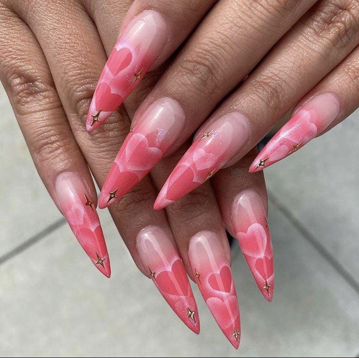 This design features a soft pink ombre fading into a natural base, decorated with layered heart shapes for a romantic Valentine look. The long stiletto shape adds elegance while keeping the vibe sweet and feminine.