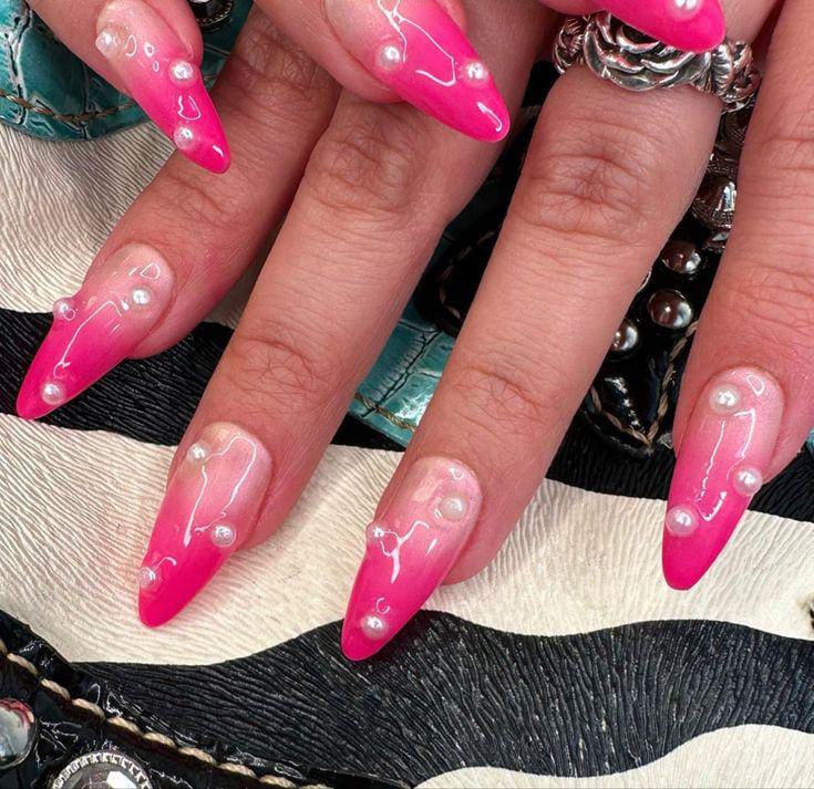 Bright pink ombre tips paired with a glossy finish give this design a bold yet playful Valentine feel. Pearl embellishments add a trendy, modern touch.