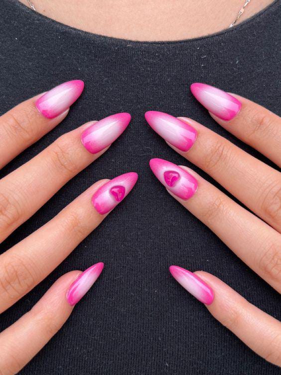 These nails showcase a vibrant pink ombre fading into a lighter center with subtle heart details. The design feels bold yet elegant, giving a modern Valentine look.