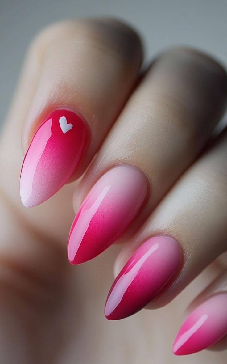 A rich rose-pink ombre creates a dramatic yet smooth gradient with a tiny heart accent for Valentine’s charm. The design feels classy, polished, and perfect for a romantic occasion.
