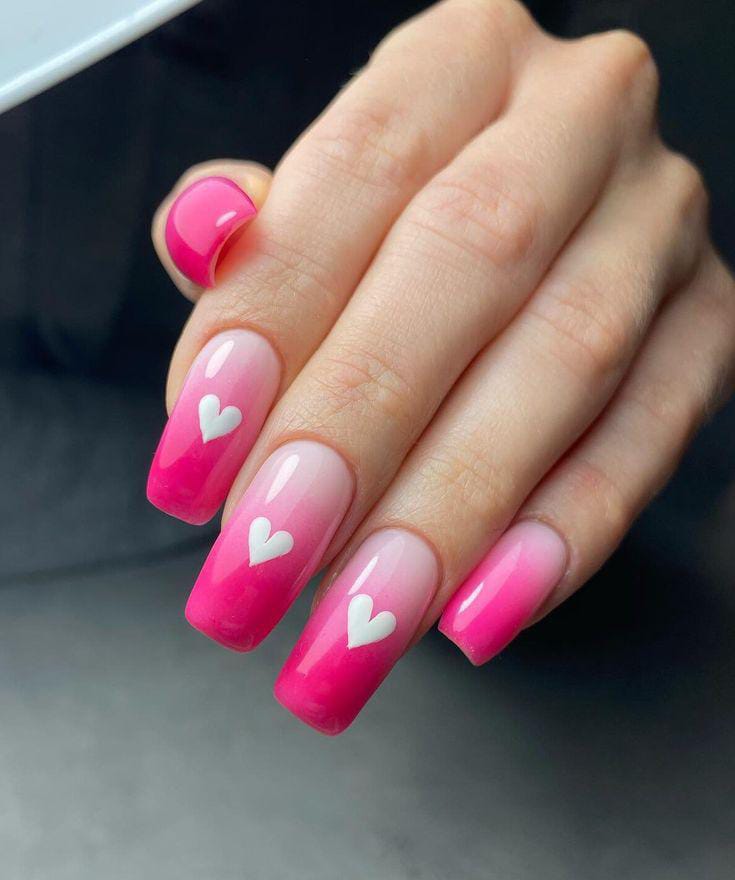 Bright pink ombre tips stand out against a sheer base, finished with crisp white heart designs. The contrast gives a playful, confident, and modern Valentine look.