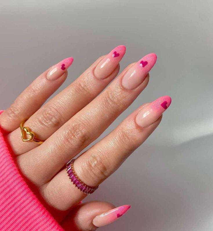 A smooth pink ombre fades from natural nude to bright rosy tips, decorated with tiny heart details and light sparkle. The style feels playful, youthful, and effortlessly Valentine-ready.
