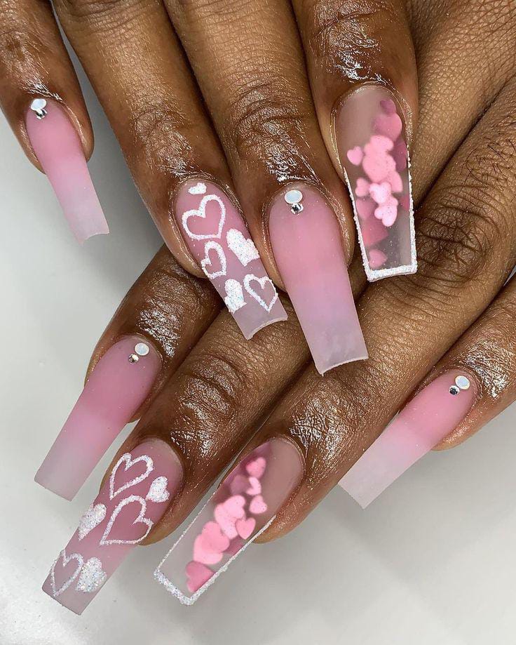 This design combines a soft pink ombre with translucent nails filled with floating heart shapes. It has a playful, romantic charm Valentines that feels light, cute, and eye-catching.