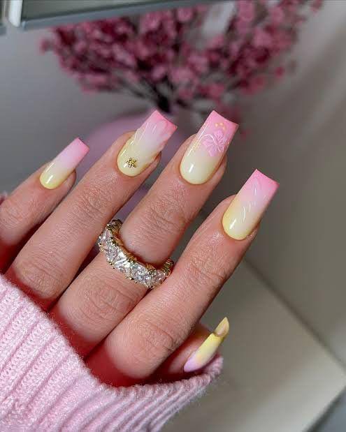 A gentle pink-to-yellow ombre creates a smooth, elegant base with subtle shimmer details. The look is feminine, polished, and perfect for a soft Valentine-inspired manicure.