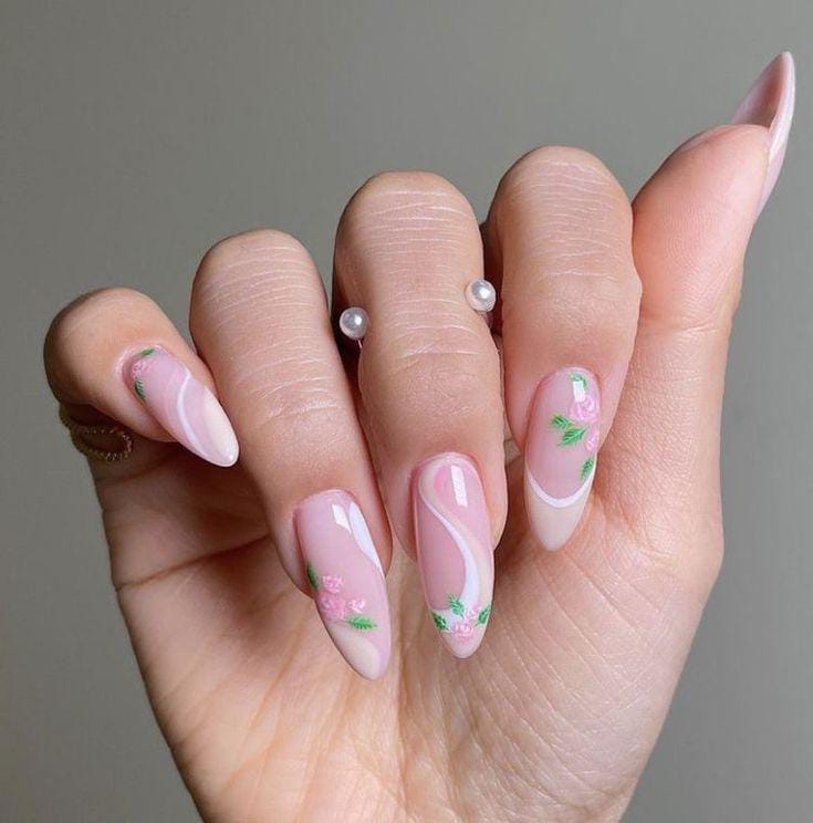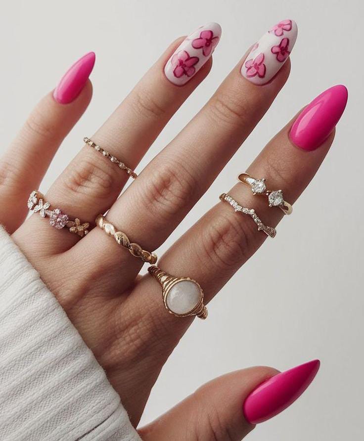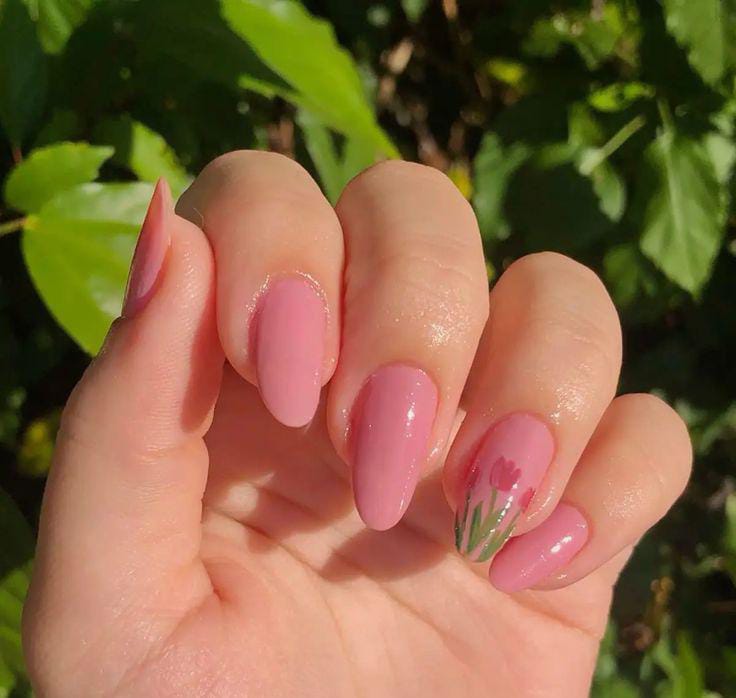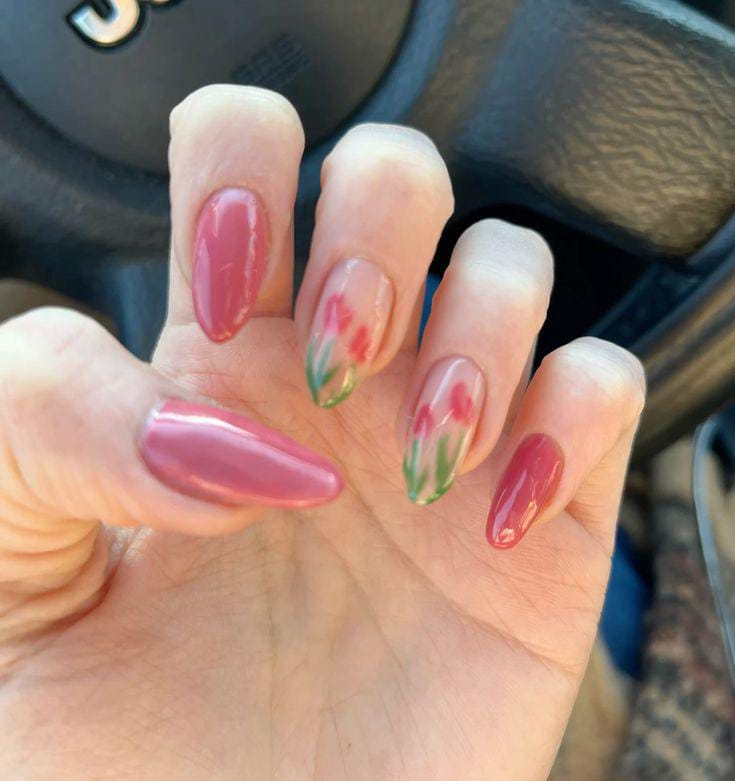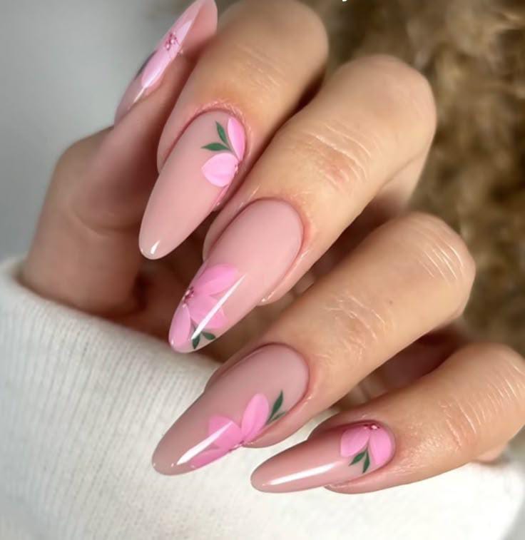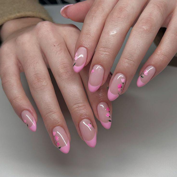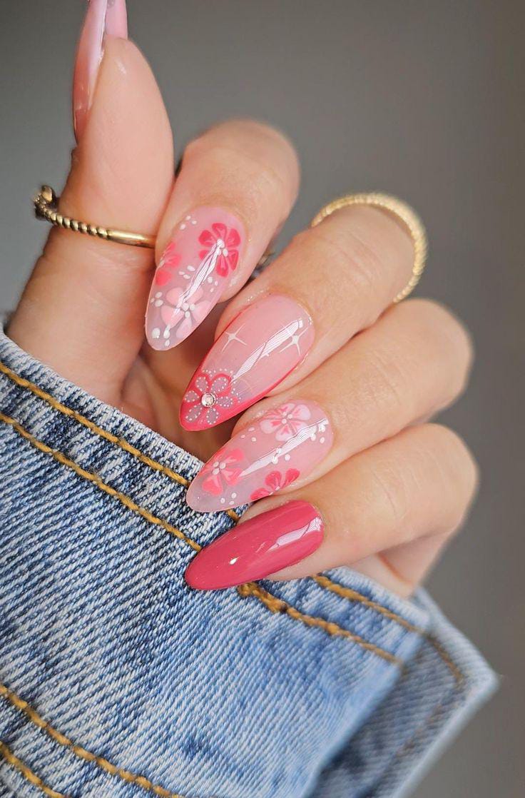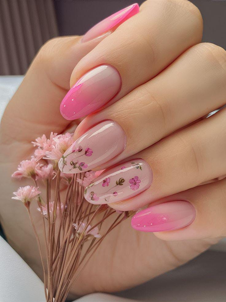 Soft pink almond nails with delicate floral accents create a fresh and romantic spring look. The mix of solid pink and sheer floral nails feels elegant and feminine.