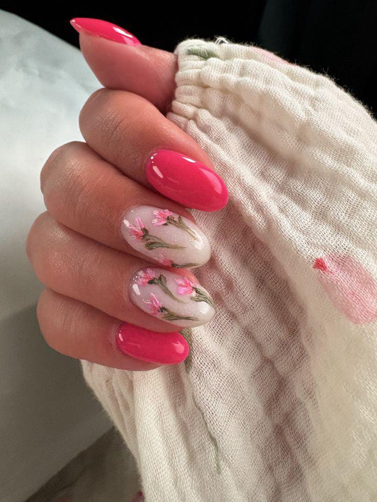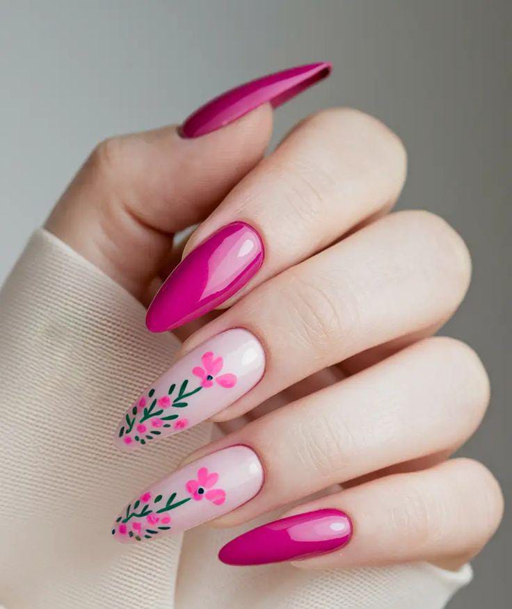 Glossy hot pink nails paired with soft floral accent nails create a stylish contrast. The overall vibe is modern, polished, and very spring-ready.