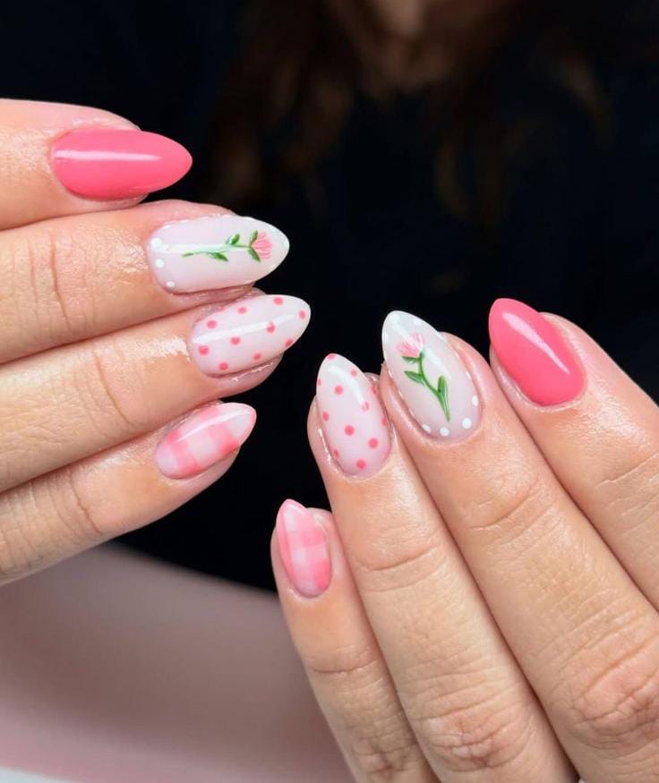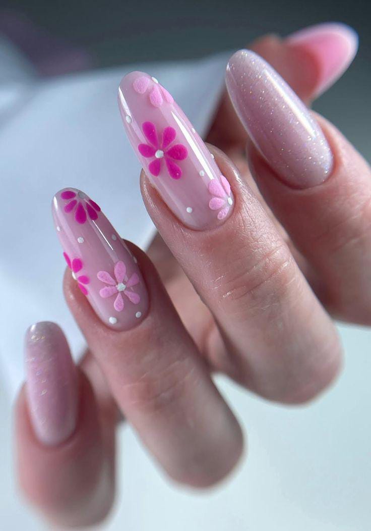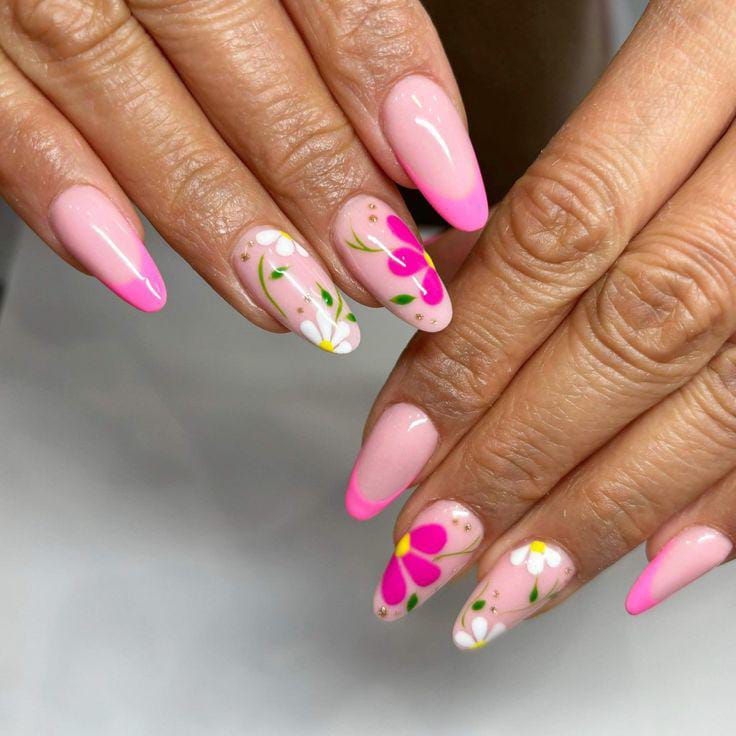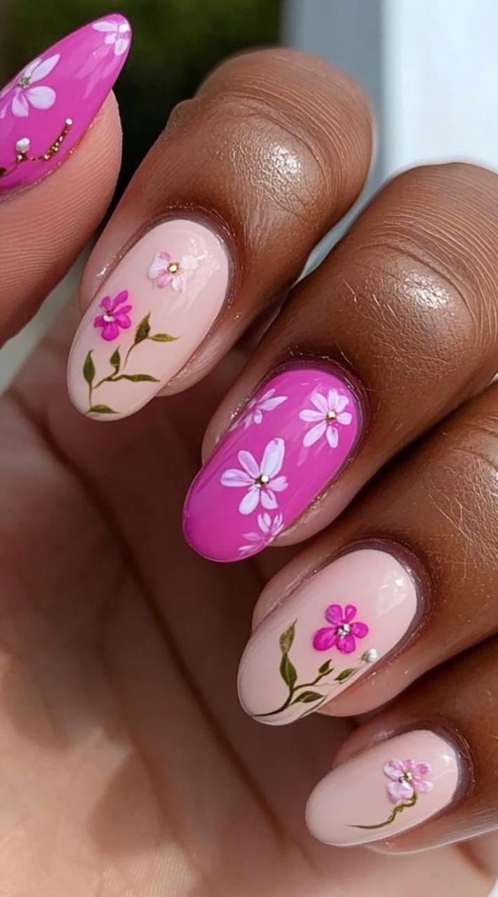 A mix of soft nude and vibrant pink nails decorated with delicate flowers and tiny details. This design has a balanced spring vibe that feels both elegant and lively.
