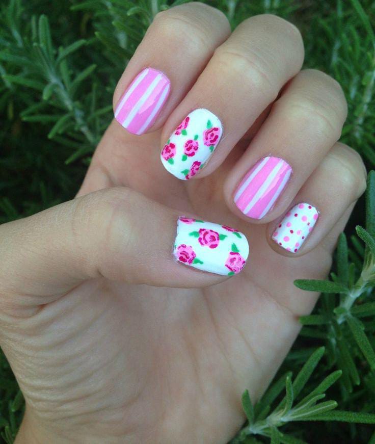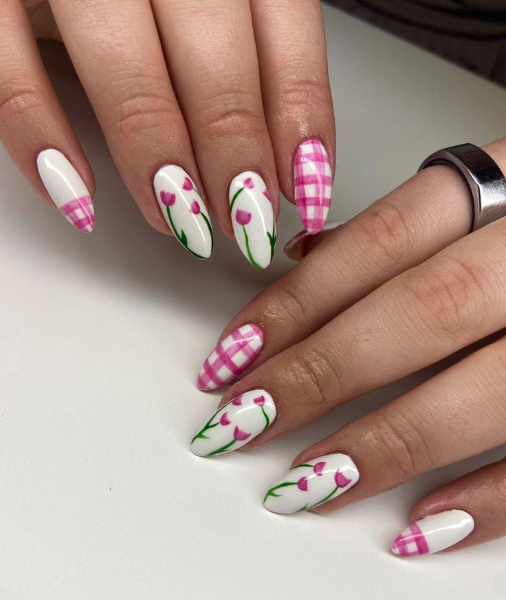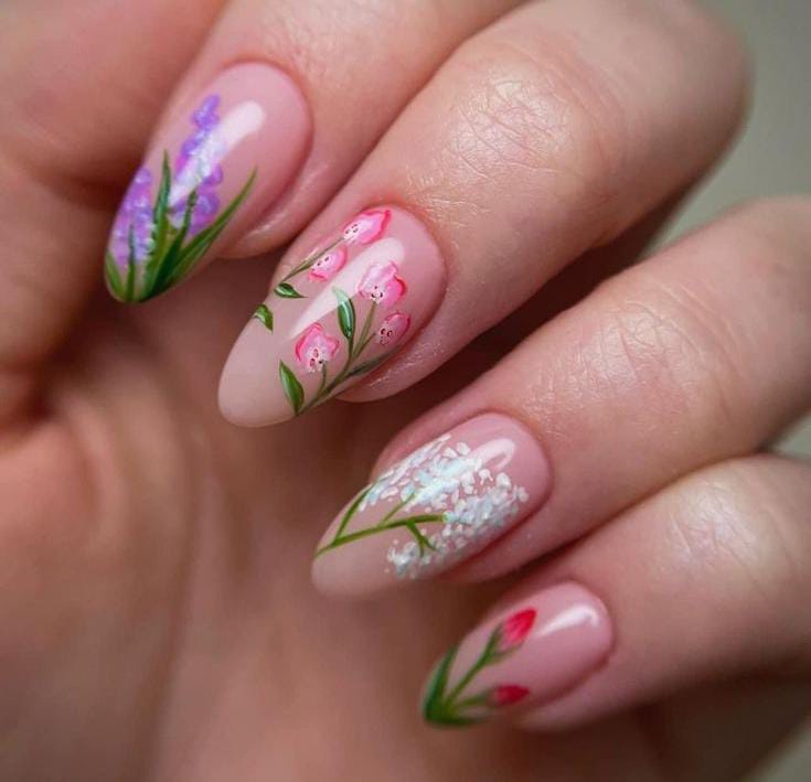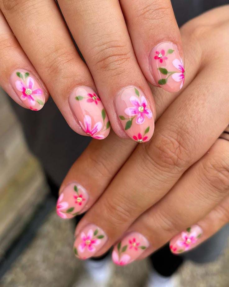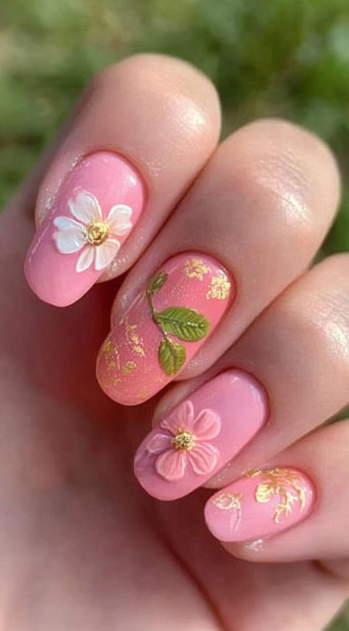 A mix of soft nude and vibrant pink nails decorated with delicate flowers and tiny details. This design has a balanced spring vibe that feels both elegant and lively.