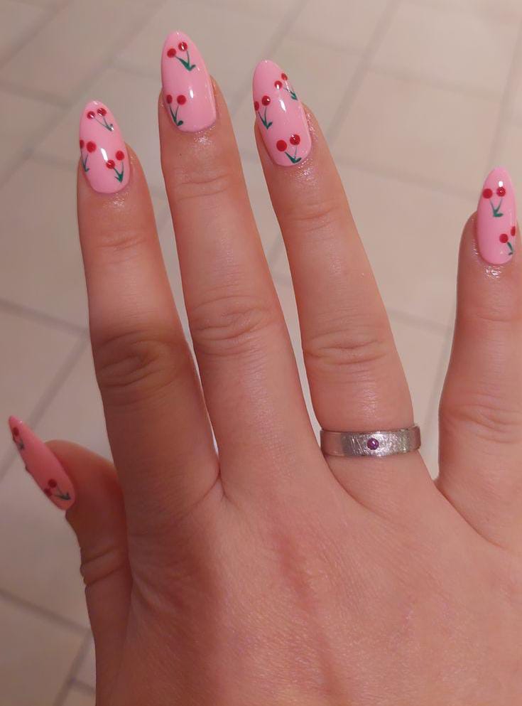 A glossy baby-pink base is paired with tiny red cherry-style florals for a playful spring vibe. It feels cute, minimal, and youthful.