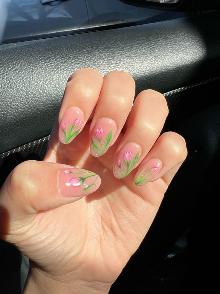 Translucent pink nails feature soft green leaves and tulip-inspired florals. The overall look is airy, fresh, and very seasonal spring vibe.