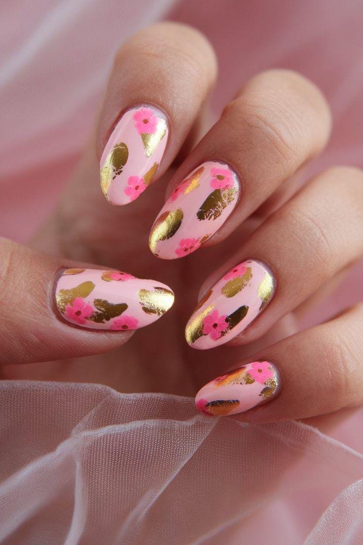 Soft pastel pink nails with tiny floral accents and touches of gold foil. The look feels fresh, feminine, and slightly luxurious for spring.