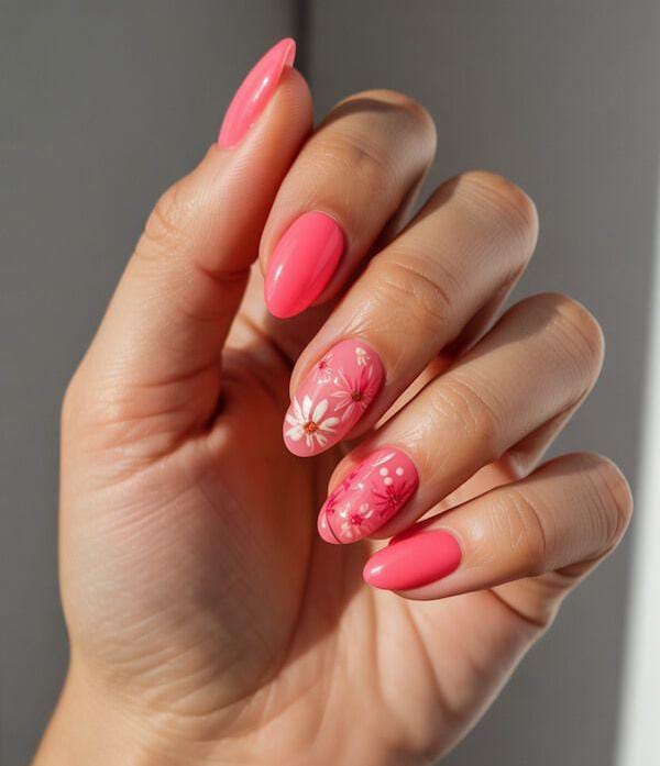 Bright pink-coral nails paired with simple floral artwork on accent nails. The design looks cheerful, bold, and full of spring energy.