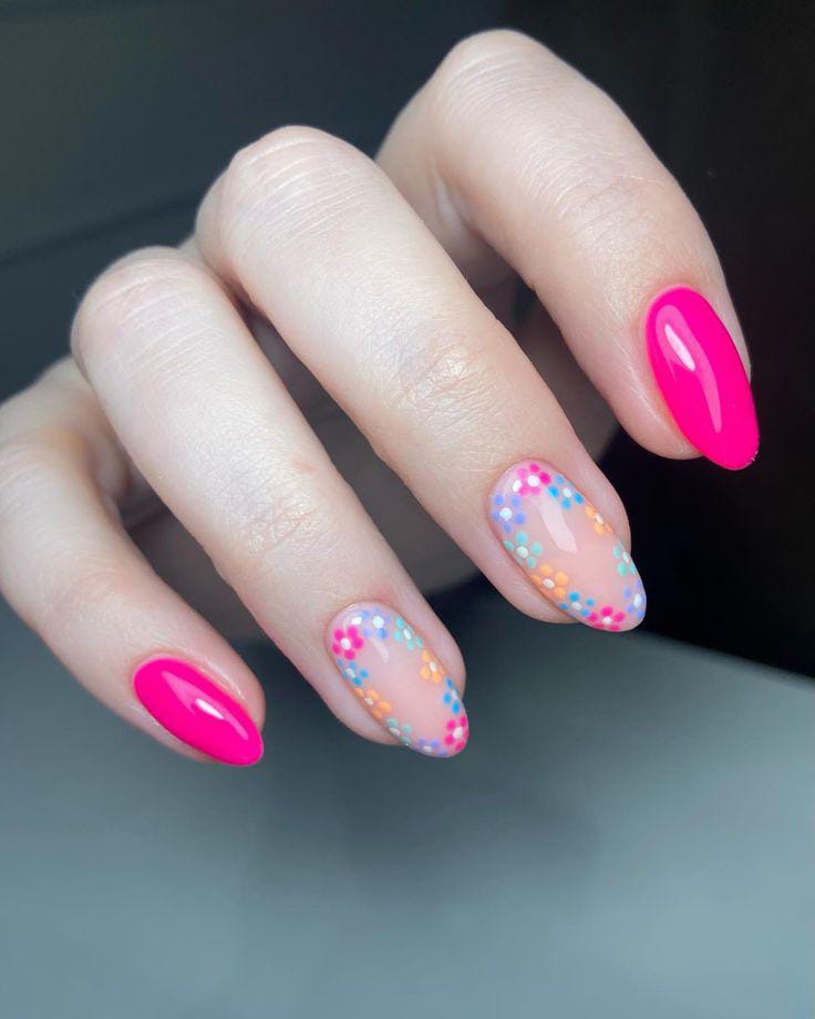 Bright pink nails paired with playful multicolor dotted floral details on nude bases give this design a fun, cheerful energy. It feels youthful, modern, and perfect for spring days.