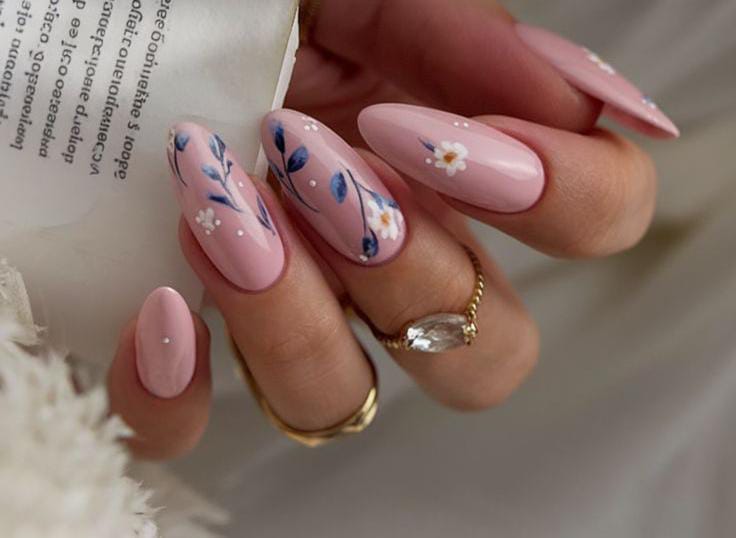 Soft pink nails with hand-painted floral accents create a fresh, romantic spring look. The design feels light, delicate, and effortlessly feminine.