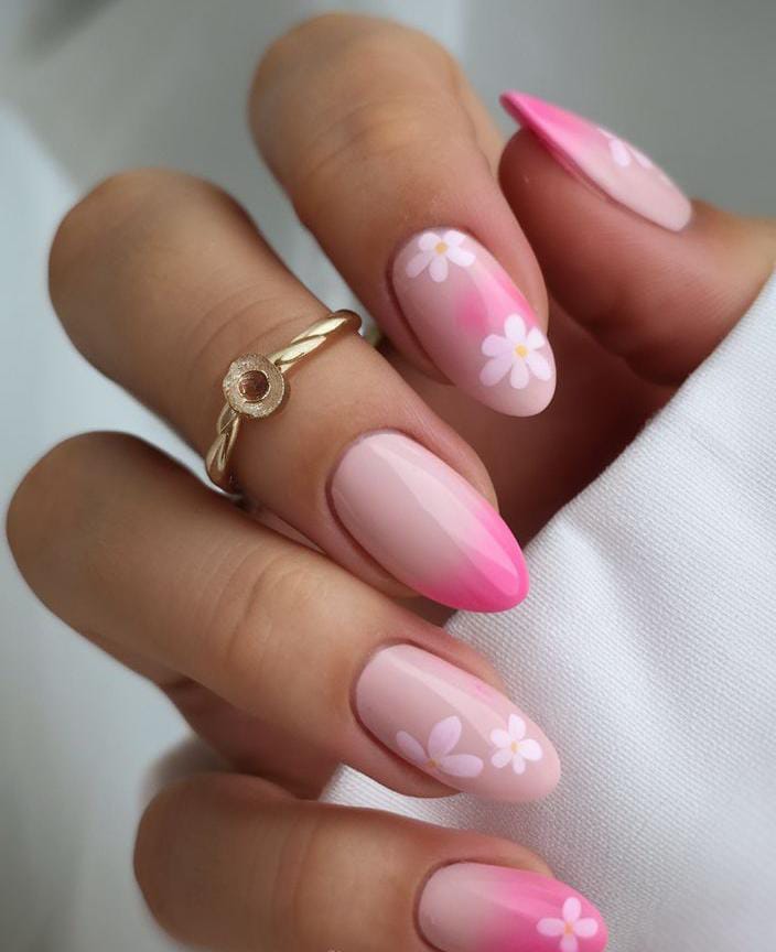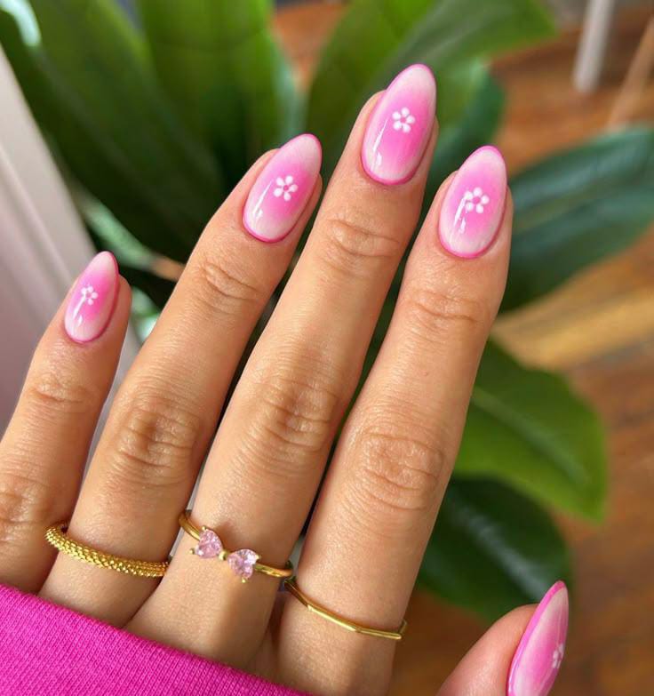 A gentle pink ombre fades smoothly across the nails for a soft romantic spring look. White floral accents keep the design airy and elegant.
