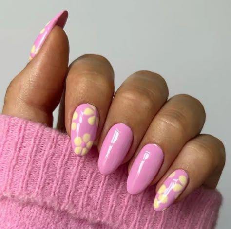 Bright pink nails feel cheerful and fun for spring days. Yellow and white floral patterns add a youthful and lively vibe.