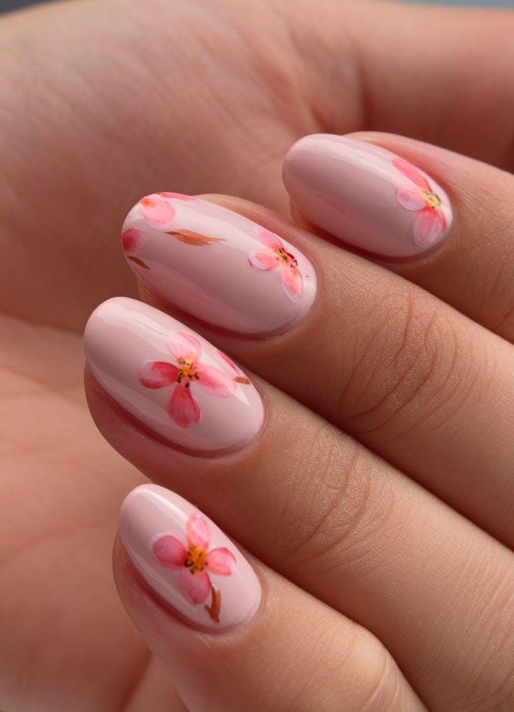 Muted nude-pink nails create a calm and polished base. Hand-painted floral details bring a subtle spring charm without feeling heavy.
