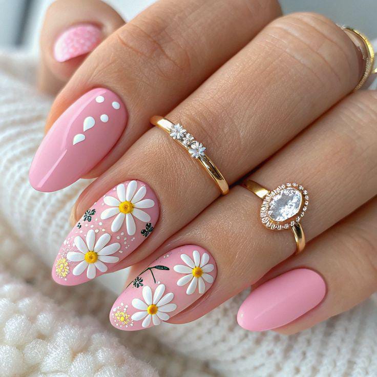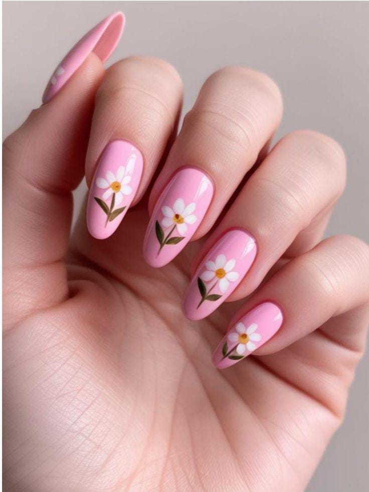 Soft pink nails with simple white daisy florals create a fresh and cheerful spring look. The design feels light, feminine, and perfect for everyday wear.