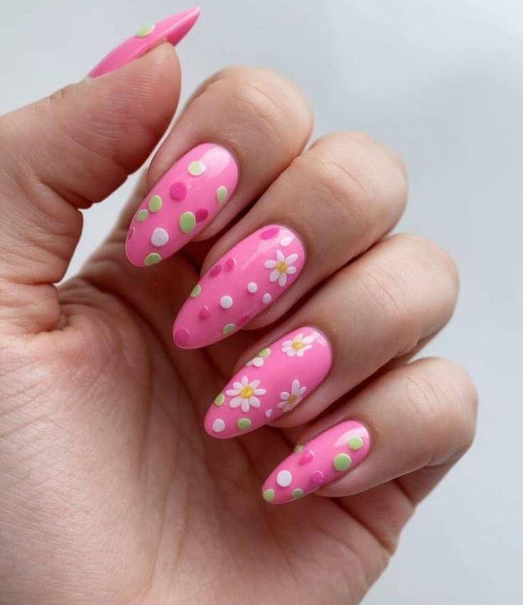 Bright pink nails with cute floral and dotted patterns bring a fun and youthful spring energy. This design feels lively, bold, and full of personality.