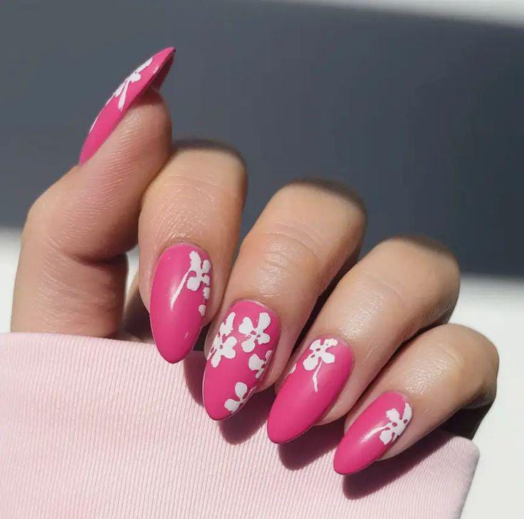 Bright pink almond nails with simple white floral accents create a fresh and playful spring look. The design feels cheerful, bold, and perfect for sunny days.