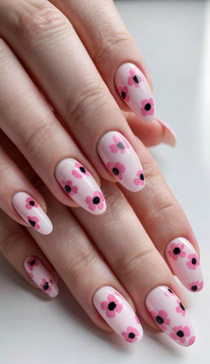 Muted pink nails with tiny white daisies create a calm and polished spring style. The look is minimal, graceful, and effortlessly pretty.