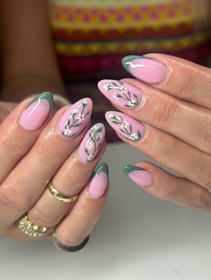 This design features a blush pink base with soft green French tips and delicate white floral accents. It feels fresh, airy, and perfect for a calm spring look.