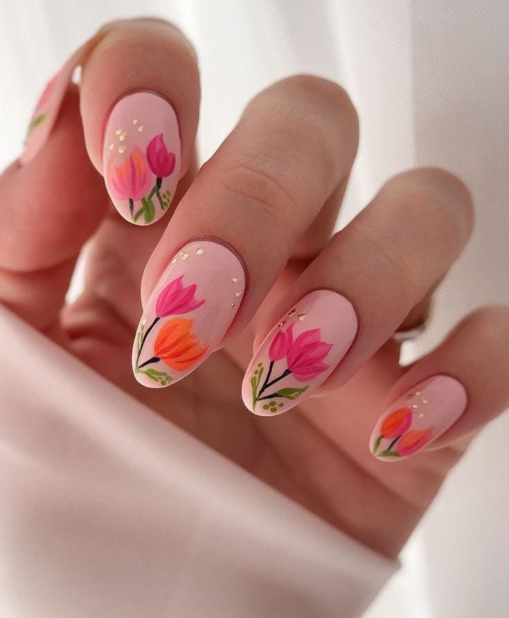 Soft pink nails are decorated with colorful tulip-style flowers and gentle gold accents. The design feels artistic, warm, and beautifully spring-ready.