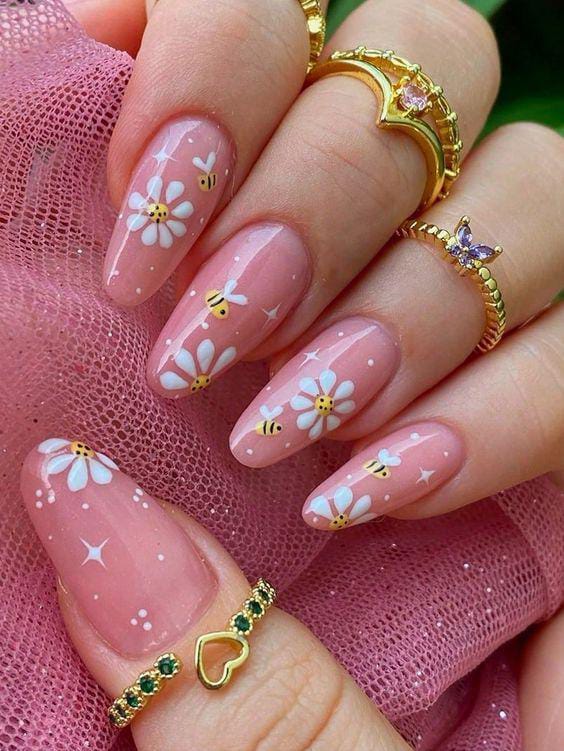 Soft blush pink nails feature white daisies and tiny bee accents for a playful spring feel. The overall look is sweet, fresh, and cheerful.