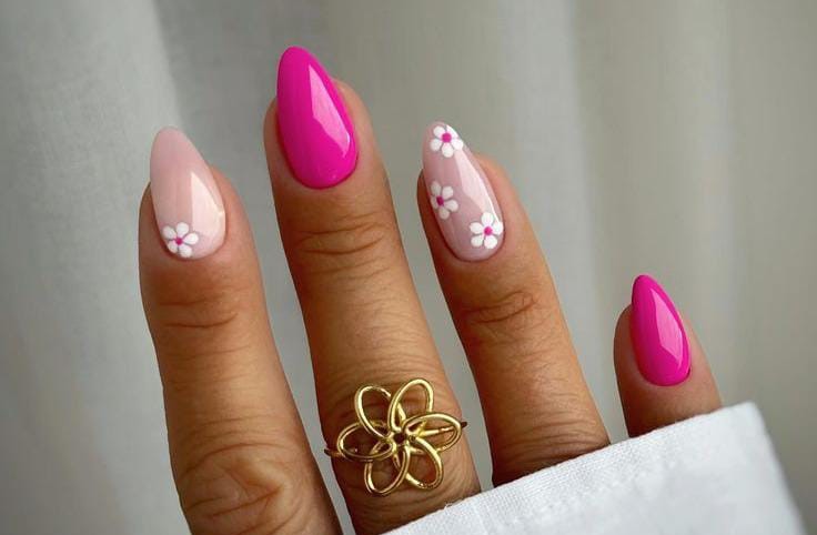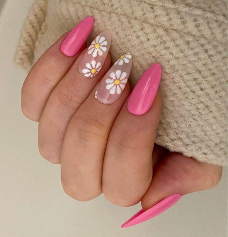 Bright pink nails are paired with neutral bases decorated with bold white daisies. The design feels warm, floral, and effortlessly pretty spring.