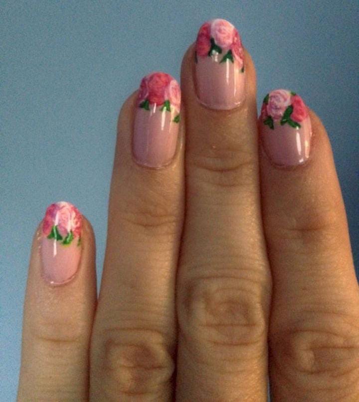 Muted blush pink nails with tiny rose details bring a soft, vintage spring charm. The overall look is simple, sweet, and effortlessly classy.