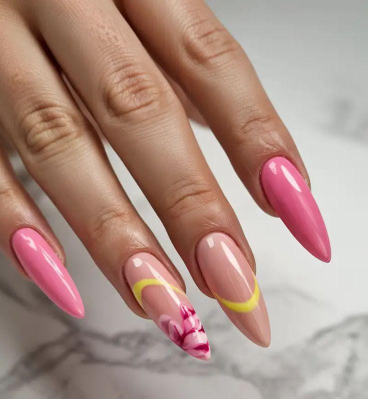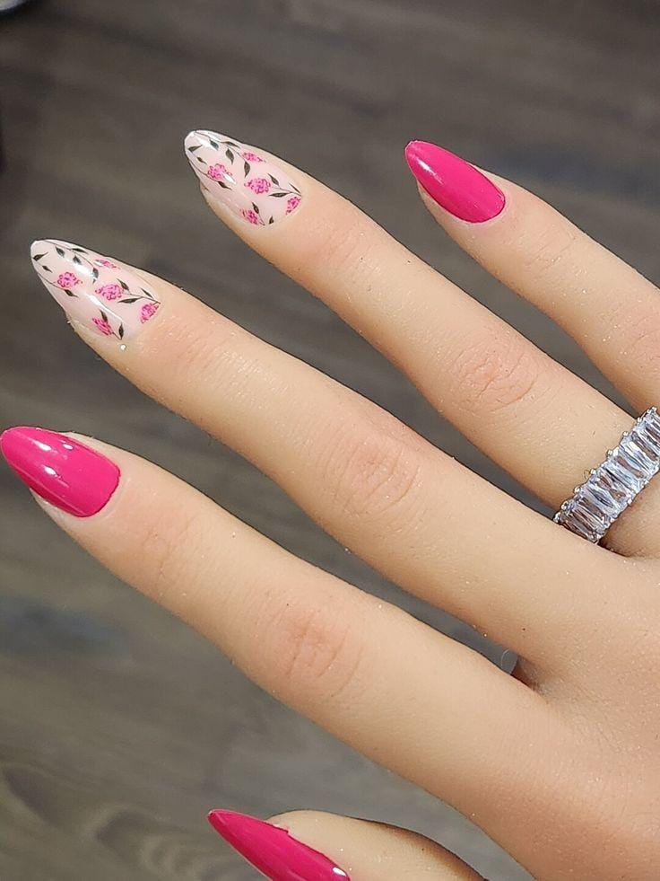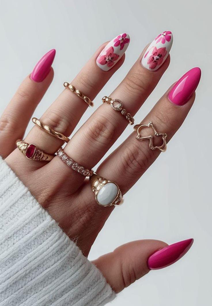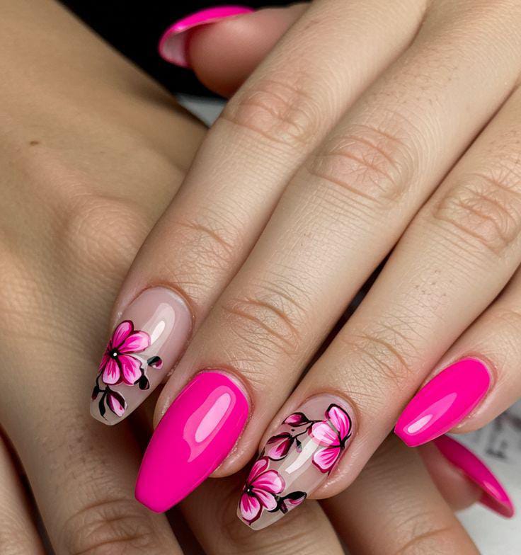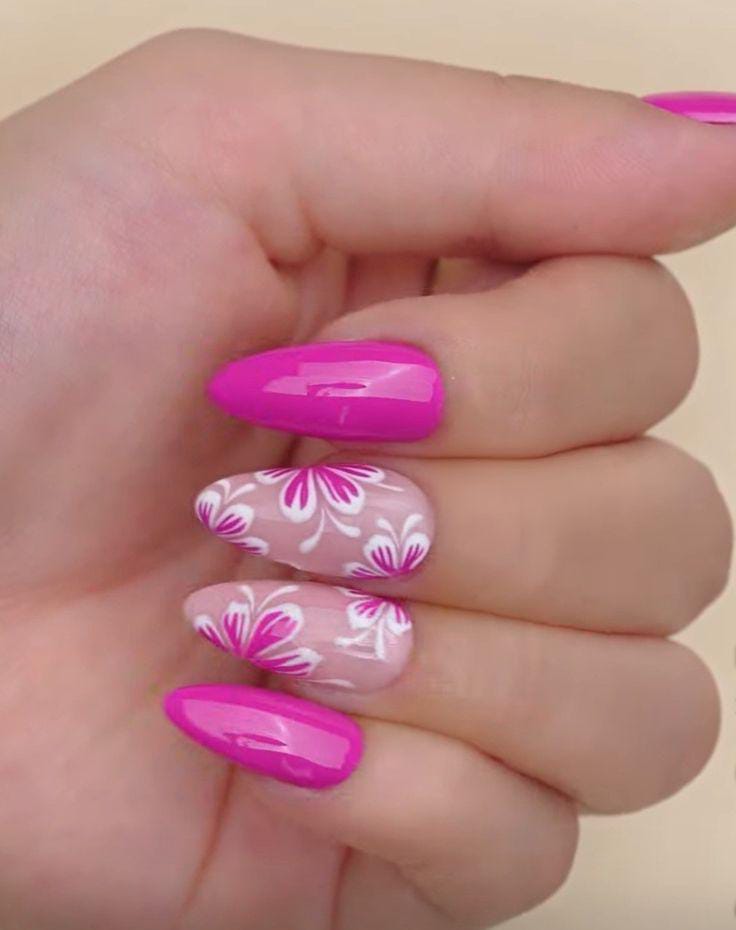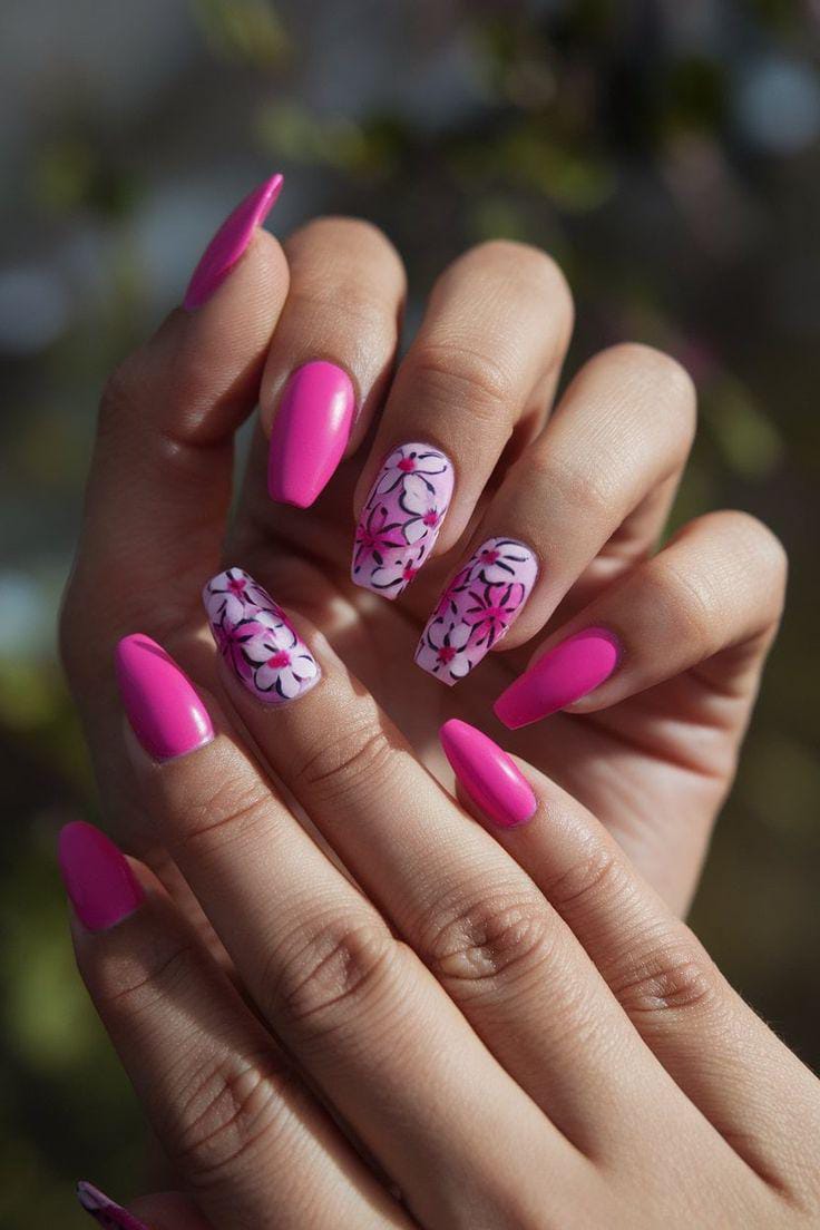 This design blends hot pink solid nails with soft pink bases featuring delicate floral art. The vibe is playful and feminine, balancing bold color with light, airy details for a fresh summer look.