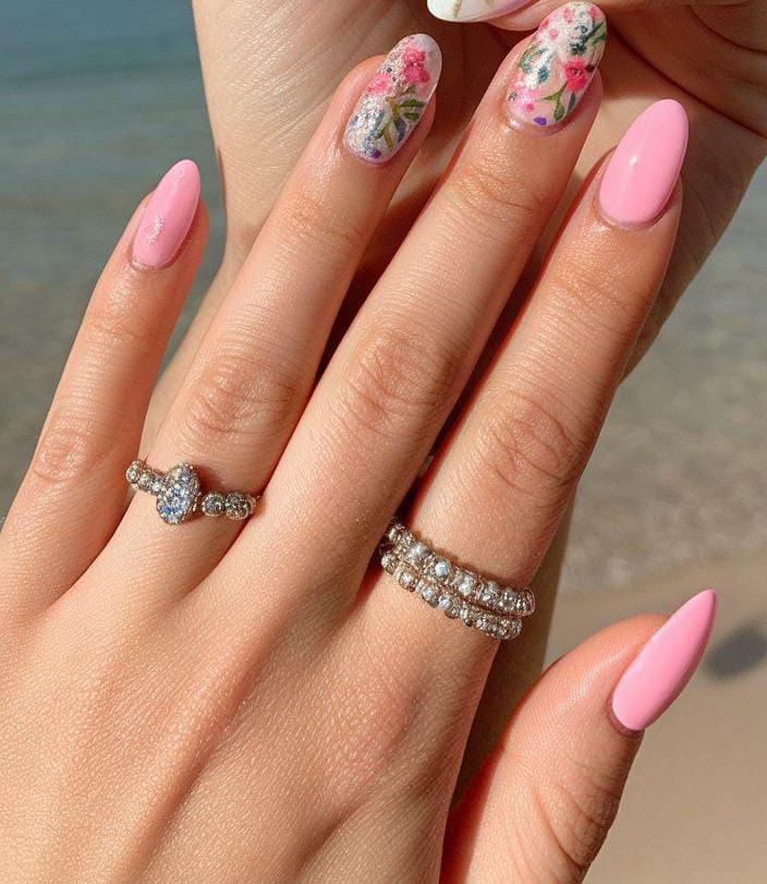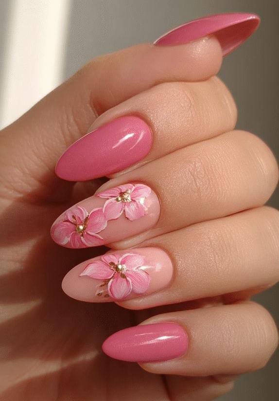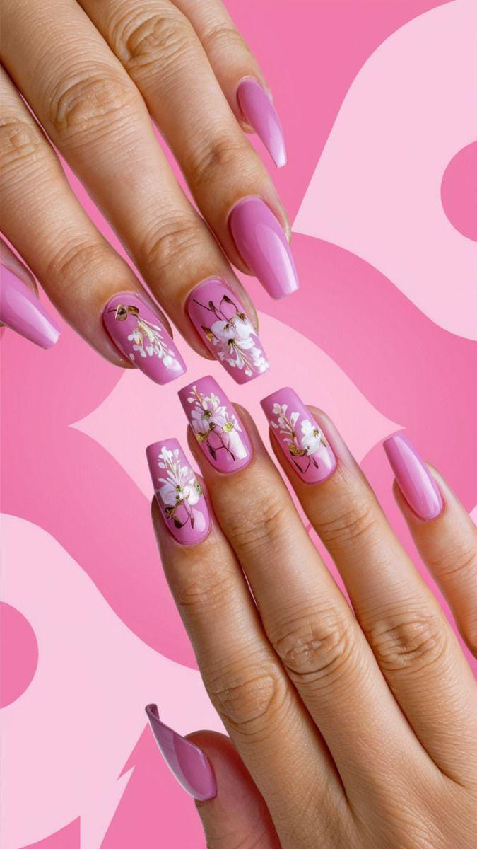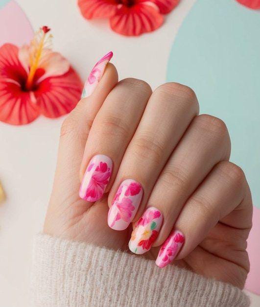 Bold pink nails are paired with sheer bases featuring white and pink petal patterns. It feels light, tropical, and playful—like a summer vacation manicure.