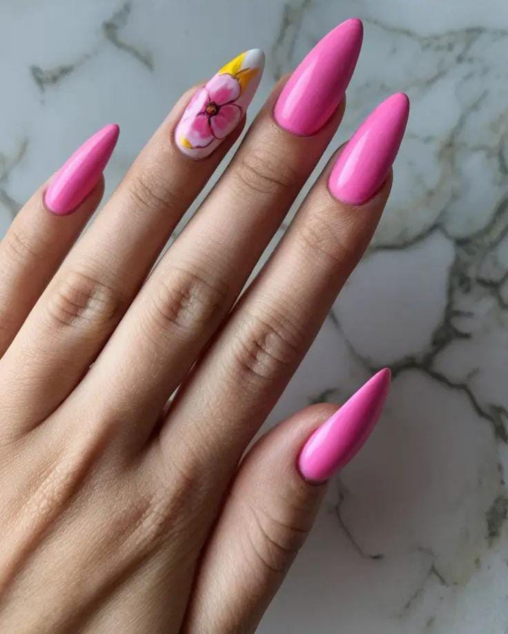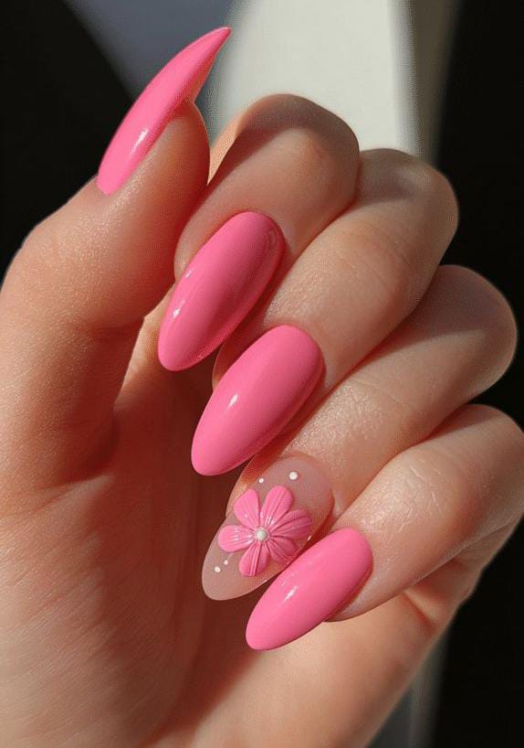 Long, vibrant pink nails are paired with a single floral accent nail that adds an artistic touch without overpowering the look. The design feels confident, stylish, and perfect for making a summer statement.