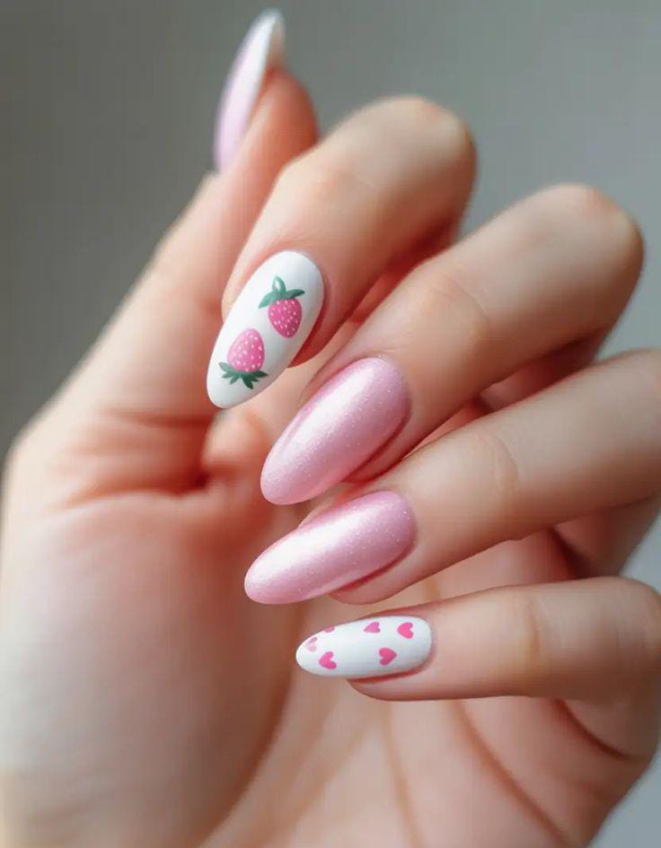 A soft pink shimmer is combined with playful white accent nails featuring tiny strawberries and heart patterns. The design feels sweet, youthful, and perfect for a fun, lighthearted summer style.