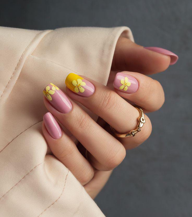 This design mixes muted pink tones with a bold yellow tip accent nail and simple flower art. The result is a fresh, cheerful look that feels modern, artsy, and ideal for sunny summer outfits.