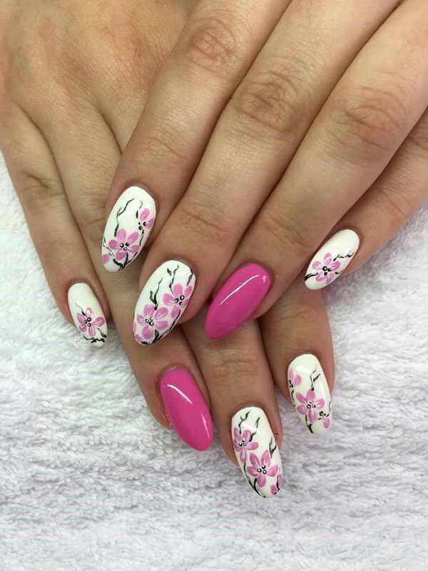 This design blends soft white and bright pink nails with hand-painted pink floral and black branches accents. The overall vibe is fresh and feminine, perfect for a cheerful summer look with a touch of elegance.