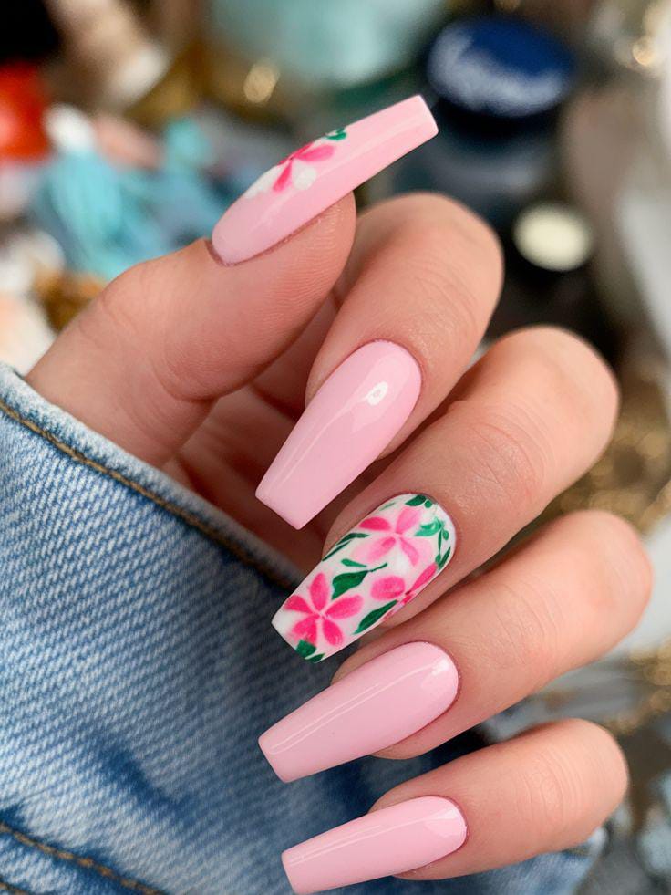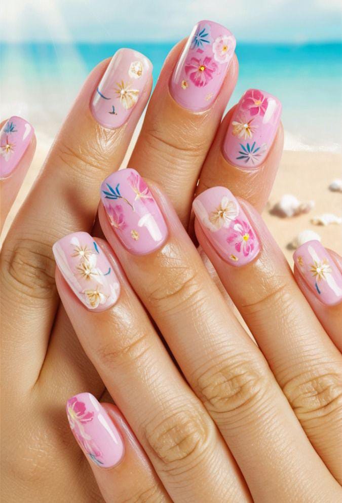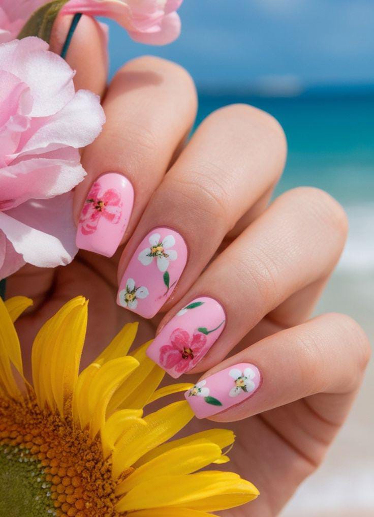 This design mixes soft baby-pink nails with delicate floral accents for a fresh, romantic summer look. The overall vibe is light, airy, and elegant, perfect for beach days or warm evenings.